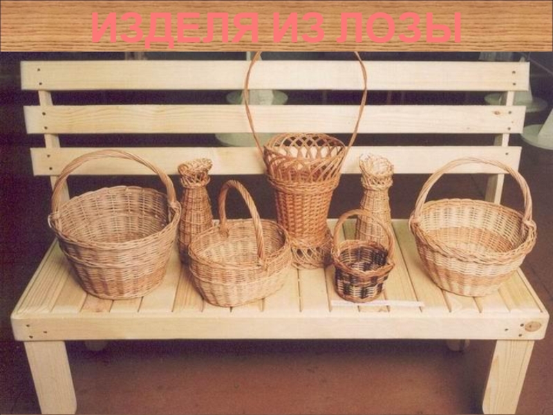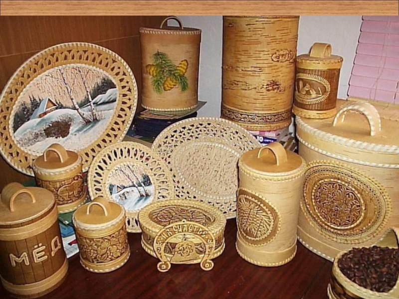 Слайд 12Из лозы и бересты плетут много различных изделий. Корзинки для сбора