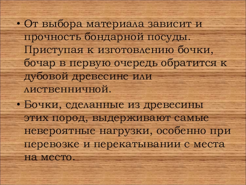 Слайд 8От выбора материала зависит и прочность бондарной посуды. Приступая к изготовлению