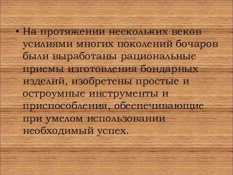 Слайд 6На протяжении нескольких веков усилиями многих поколений бочаров были выработаны рациональные