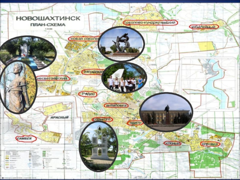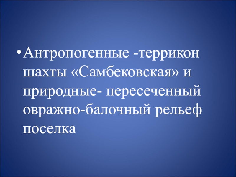 Антропогенные -террикон шахты «Самбековская» и природные- пересеченный овражно-балочный рельеф поселка