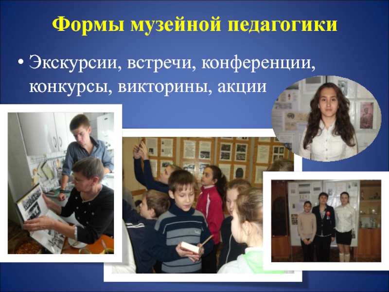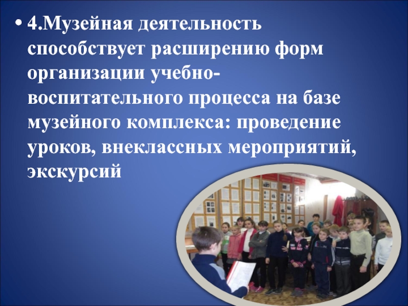 4.Музейная деятельность способствует расширению форм организации учебно-воспитательного процесса на базе музейного комплекса: проведение уроков, внеклассных мероприятий, экскурсий