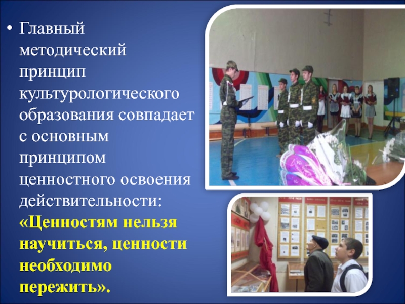 Главный методический принцип культурологического образования совпадает с основным принципом ценностного освоения действительности: «Ценностям нельзя научиться, ценности необходимо пережить».