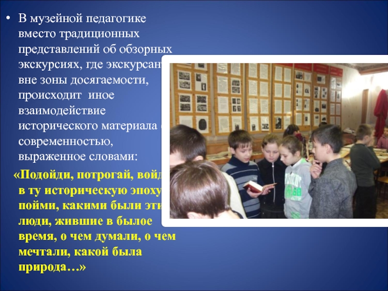 В музейной педагогике вместо традиционных представлений об обзорных экскурсиях, где экскурсанты вне зоны досягаемости, происходит иное взаимодействие исторического материала с современностью, выраженное словами: