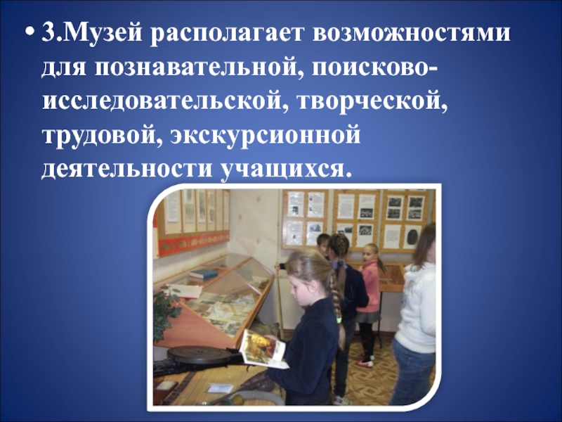 3.Музей располагает возможностями для познавательной, поисково-исследовательской, творческой, трудовой, экскурсионной деятельности учащихся.