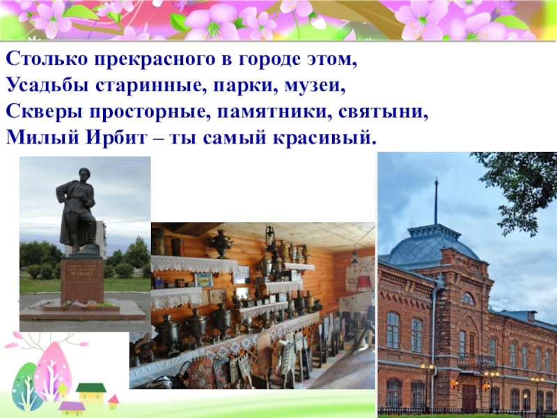 Столько прекрасного в городе этом, Усадьбы старинные, парки, музеи, Скверы просторные, памятники, святыни, Милый Ирбит – ты