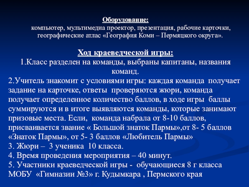 2.Учитель знакомит с условиями игры: каждая команда получает задание на карточке, ответы проверяются жюри, команда получает определенное количество баллов, в ходе игры баллы суммируются и в итоге выявляются команды, которые занимают призовые места. Если, команда набрала от 8-10 баллов, присваивается звание « Большой знаток Пармы»,от 8- 5 баллов «Знаток Пармы», от 5- 3 баллов «Любитель Пармы»
