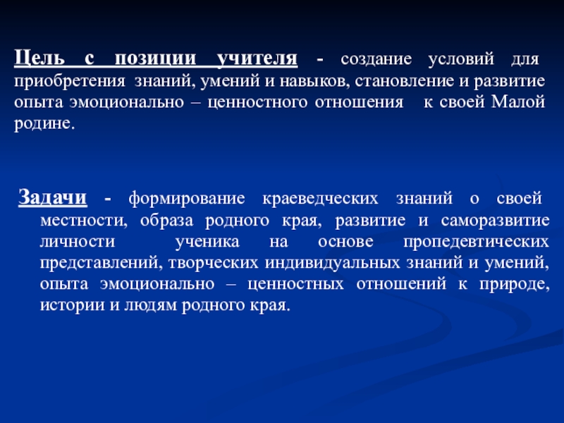 Цель с позиции учителя - создание условий для приобретения знаний, умений и навыков, становление и развитие опыта эмоционально – ценностного отношения к своей Малой родине.