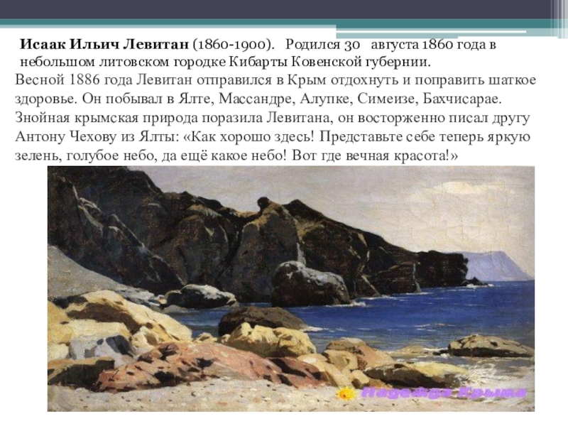 В сентябре 1887 года В.Д.Поленов писал жене из Ялты: «Чем больше я хожу по окрестностям Ялты, тем все больше оцениваю наброски Левитана. Ни Айвазовский, ни Лагорио, ни Шишкин, ни Мясоедов не дали таких правдивых и характерных изображений Крыма, как Левитан».