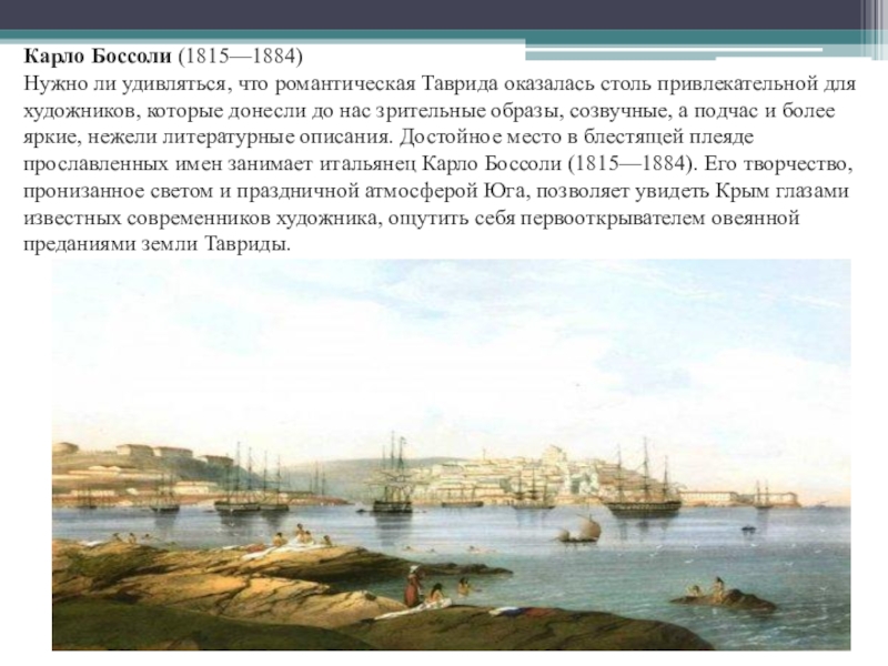 художников, которые донесли до нас зрительные образы, созвучные, а подчас и более яркие, нежели литературные описания. Достойное место в блестящей плеяде прославленных имен занимает итальянец Карло Боссоли (1815—1884). Его творчество, пронизанное светом и праздничной атмосферой Юга, позволяет увидеть Крым глазами известных современников художника, ощутить себя первооткрывателем овеянной преданиями земли Тавриды.