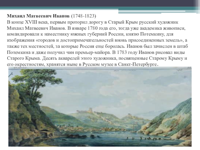 Крым русский художник Михаил Матвеевич Иванов. В январе 1780 года его, тогда уже академика живописи, командировали к наместнику южных губерний России, князю Потемкину, для изображения «городов и достопримечательностей вновь присоединенных земель», а также тех местностей, за которые Россия еще боролась. Иванов был зачислен в штаб Потемкина и даже получил чин премьер-майора. В 1783 году Иванов рисовал виды Старого Крыма. Десять акварелей этого художника, посвященные Старому Крыму и его окрестностям, хранятся ныне в Русском музее в Санкт-Петербурге.
