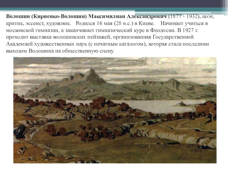 Слайд 8Волошин (Кириенко-Волошин) Максимилиан Александрович (1877 - 1932), поэт, критик, эссеист, художник.