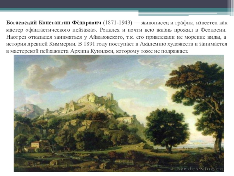 Слайд 7Богаевский Константин Фёдорович (1871-1943) — живописец и график, известен как мастер