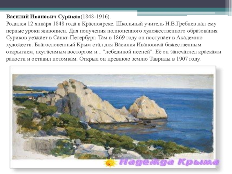 Н.В.Гребнев дал ему первые уроки живописи. Для получения полноценного художественного образования Суриков уезжает в Санкт-Петербург. Там в 1869 году он поступает в Академию художеств. Благословенный Крым стал для Василия Ивановича божественным открытием, неугасимым восторгом и... "лебединой песней". Её он запечатлел красками радости и оставил потомкам. Открыл он древнюю землю Тавриды в 1907 году.
