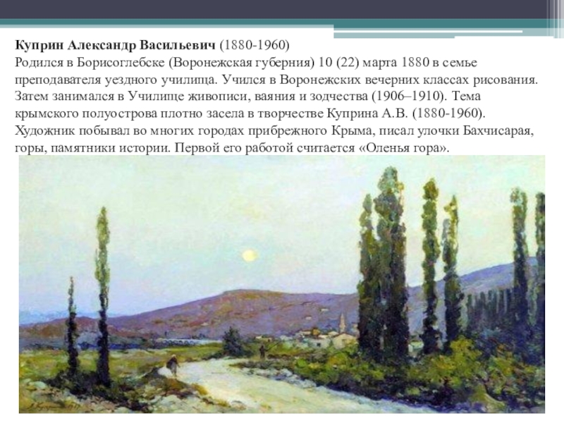 в семье преподавателя уездного училища. Учился в Воронежских вечерних классах рисования. Затем занимался в Училище живописи, ваяния и зодчества (1906–1910). Тема крымского полуострова плотно засела в творчестве Куприна А.В. (1880-1960). Художник побывал во многих городах прибрежного Крыма, писал улочки Бахчисарая, горы, памятники истории. Первой его работой считается «Оленья гора».