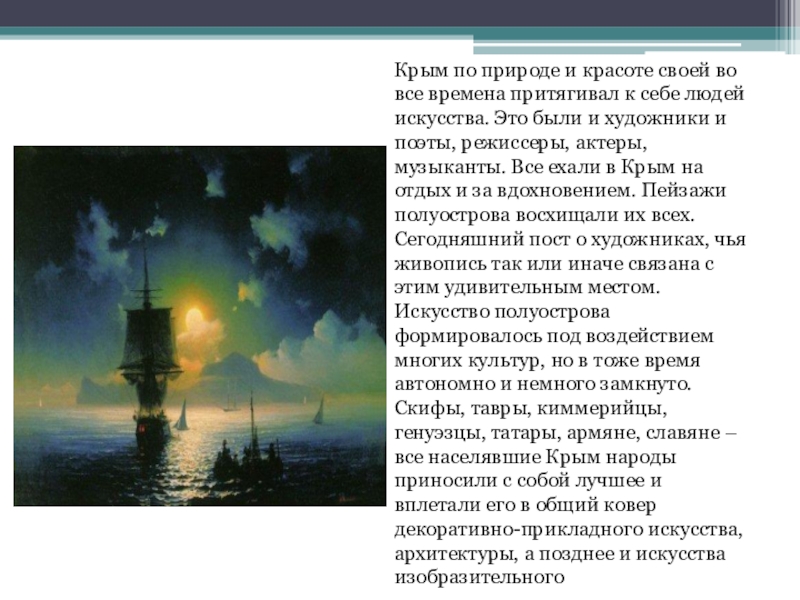 Искусство полуострова формировалось под воздействием многих культур, но в тоже время автономно и немного замкнуто. Скифы, тавры, киммерийцы, генуэзцы, татары, армяне, славяне – все населявшие Крым народы приносили с собой лучшее и вплетали его в общий ковер декоративно-прикладного искусства, архитектуры, а позднее и искусства изобразительного
