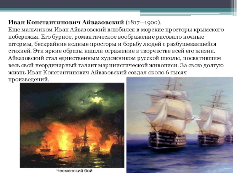 побережья. Его бурное, романтическое воображение рисовало ночные штормы, бескрайние водные просторы и борьбу людей с разбушевавшейся стихией. Эти яркие образы нашли отражение в творчестве всей его жизни. Айвазовский стал единственным художником русской школы, посвятившим весь свой неординарный талант маринистической живописи. За свою долгую жизнь Иван Константинович Айвазовский создал около 6 тысяч произведений.