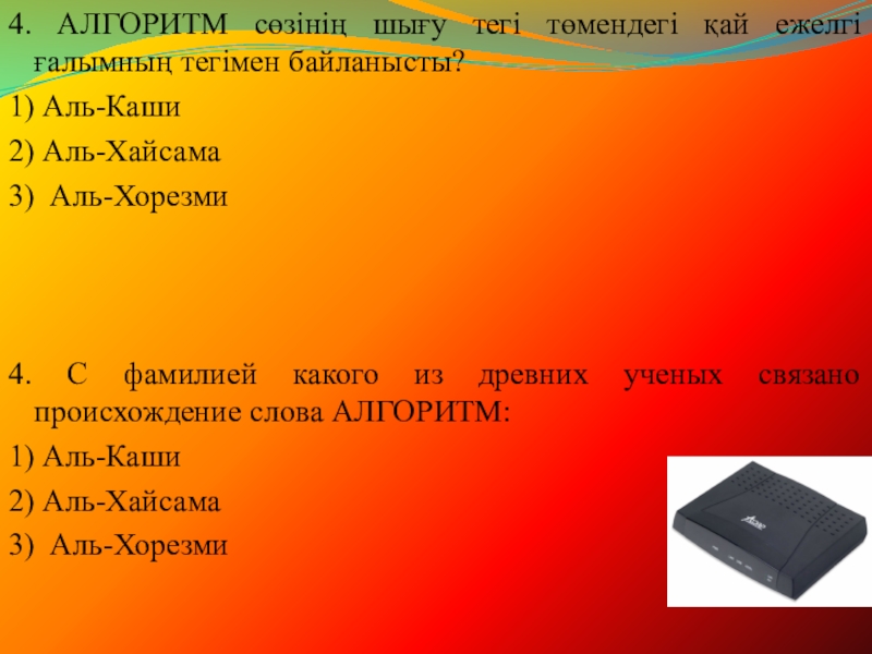 Слайд 414. АЛГОРИТМ сөзінің шығу тегі төмендегі қай ежелгі ғалымның тегімен байланысты?
