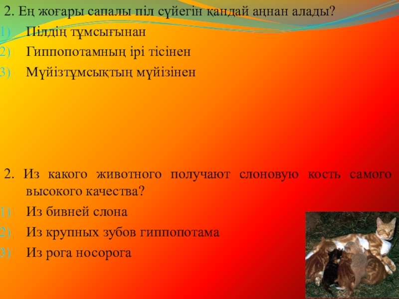 Слайд 322. Ең жоғары сапалы піл сүйегін қандай аңнан алады?