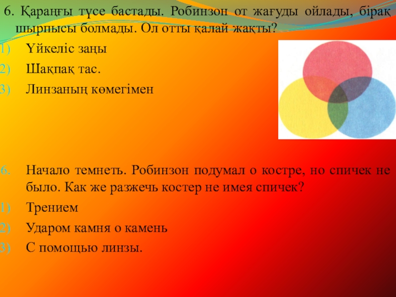 Слайд 86. Қараңғы түсе бастады. Робинзон от жағуды ойлады, бірақ шырпысы болмады.