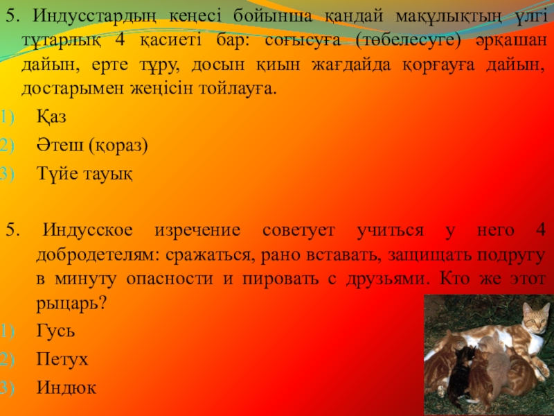 Слайд 355. Индусстардың кеңесі бойынша қандай мақұлықтың үлгі тұтарлық 4 қасиеті бар: