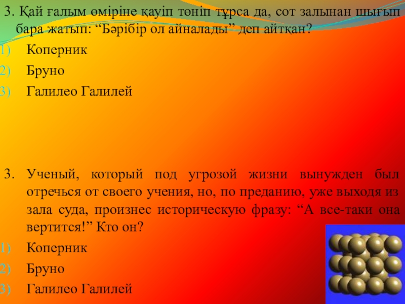 Слайд 53. Қай ғалым өміріне қауіп төніп тұрса да, сот залынан шығып