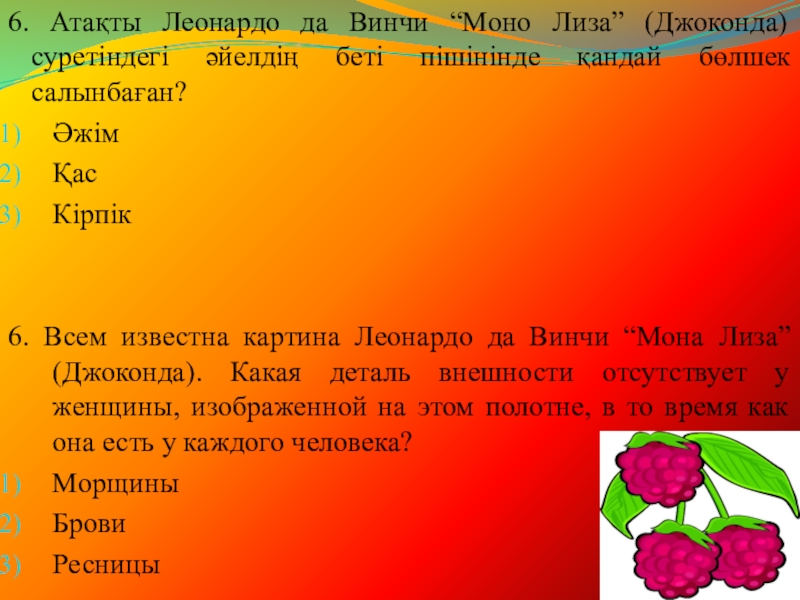 Слайд 366. Атақты Леонардо да Винчи “Моно Лиза” (Джоконда) суретіндегі әйелдің беті