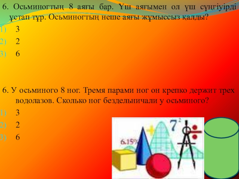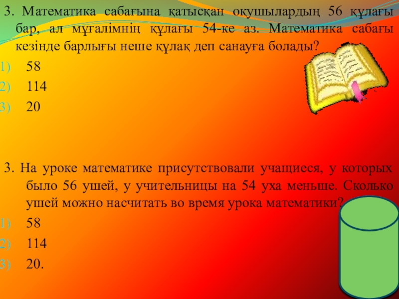 Слайд 123. Математика сабағына қатысқан оқушылардың 56 құлағы бар, ал мұғалімнің құлағы