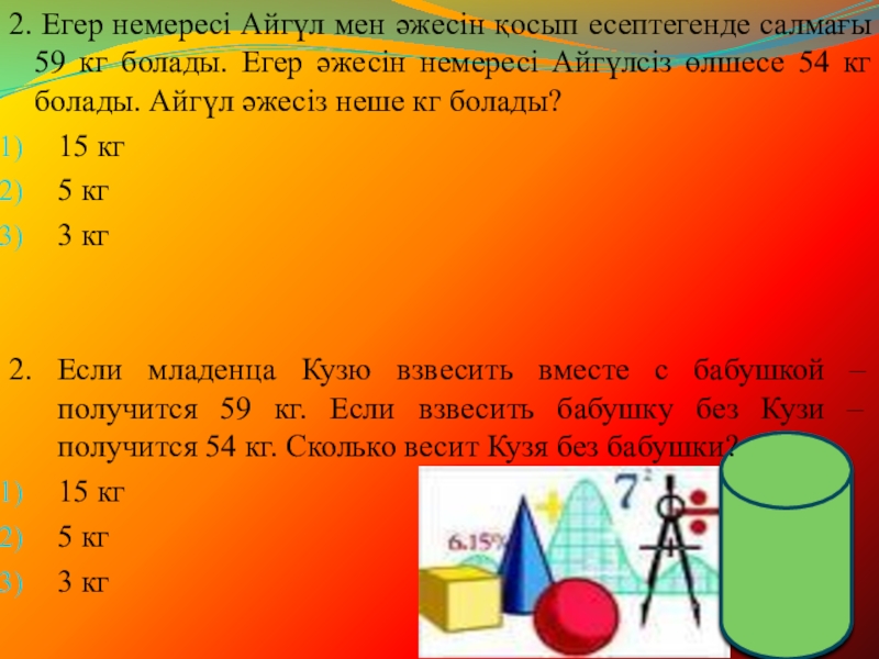 Слайд 112. Егер немересі Айгүл мен әжесін қосып есептегенде салмағы 59 кг