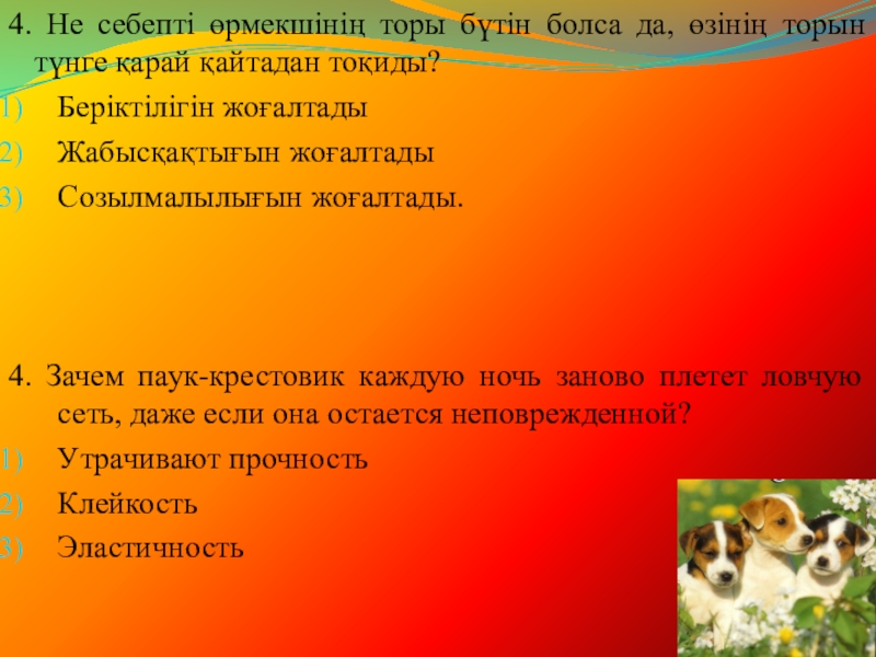 Слайд 344. Не себепті өрмекшінің торы бүтін болса да, өзінің торын түнге