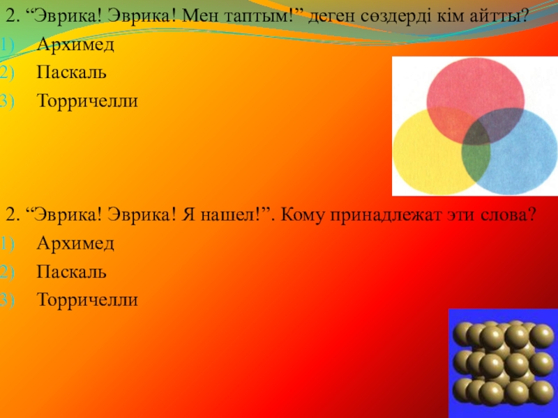 Слайд 42. “Эврика! Эврика! Мен таптым!” деген сөздерді кім айтты?