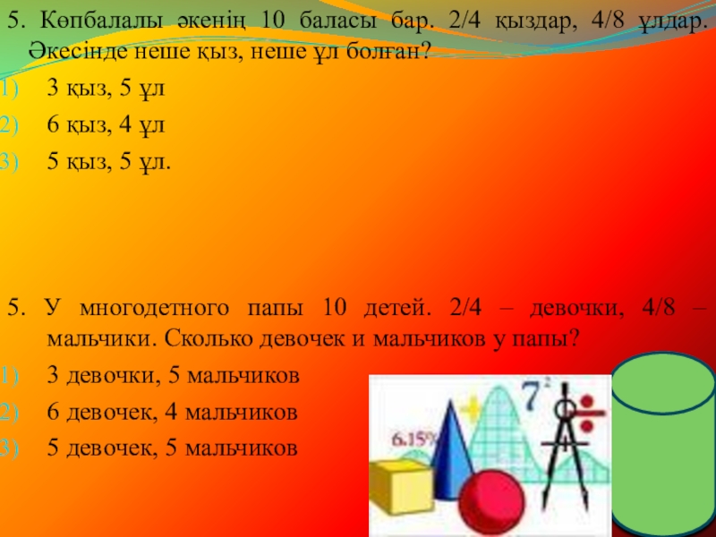 Слайд 145. Көпбалалы әкенің 10 баласы бар. 2/4 қыздар, 4/8 ұлдар. Әкесінде