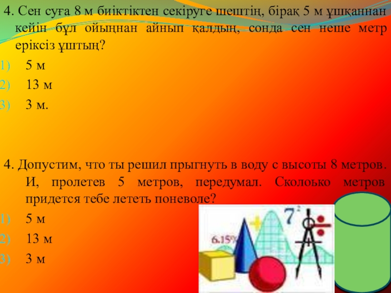 Слайд 134. Сен суға 8 м биіктіктен секіруге шештің, бірақ 5 м