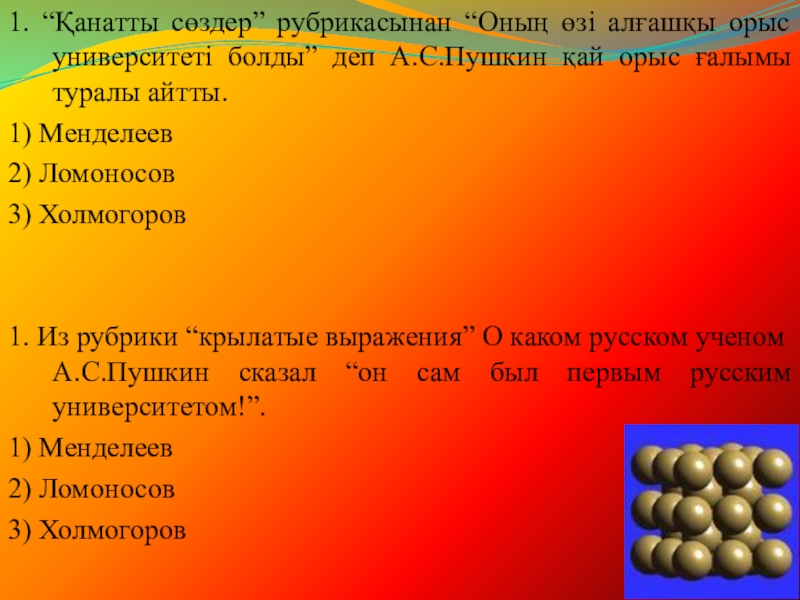 Слайд 31. “Қанатты сөздер” рубрикасынан “Оның өзі алғашқы орыс университеті болды” деп