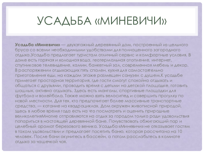 со всеми необходимыми удобствами для полноценного загородного отдыха.Усадьба предлагает туристам отличный сервис и комфортные условия. В доме есть горячая и холодная вода, геотермальная отопление, интернет, спутниковое телевидение, камин, банкетный зал, современная мебель и декор. В распоряжении отдыхающих пять спален, кухня для самостоятельно приготовления еды, на каждом этаже размещен санузел с душем.К усадьбе прилегает просторная территория, где гости смогут спокойно отдыхать и общаться с друзьями, проводить время с детьми на детской площадке, готовить шашлык, активно отдыхать. Здесь есть мангалы, спортивные площадки для футбола и волейбола. Также можно взять велосипед и совершить прогулку по новой местности. Для тех, кто предпочитает более массивные транспортные средства, — катание на квадроциклах. Дом окружен живописной природой, здесь в любое время года есть на что посмотреть и оценить природные великолепияМногие отправляются на отдых за городом только ради удовольствия попариться в настоящей деревянной бане. Почувствовать обжигающий пар и целебный аромат березового веника. Усадьба «Миневичи» не отказывает гостям в таком удовольствии и предлагает посетить баню, которая рассчитана на 10 человек. После бани окунитесь в бассейн, а потом расслабьтесь в комнате отдыха за чашечкой чая.