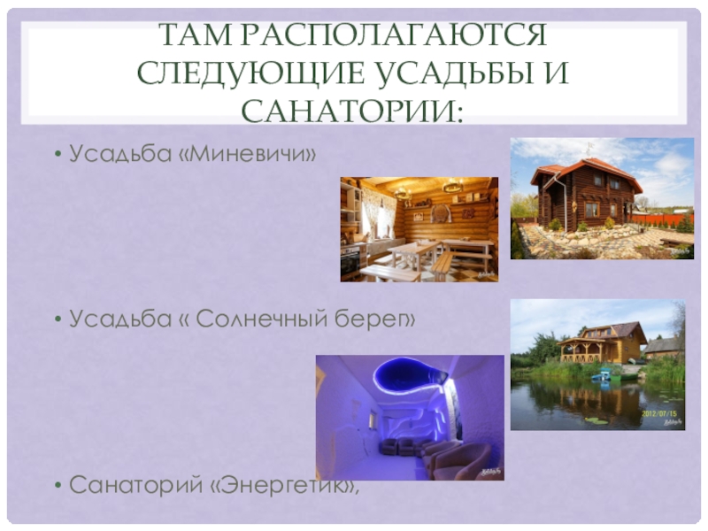 Слайд 6Там располагаются следующие усадьбы и санатории: