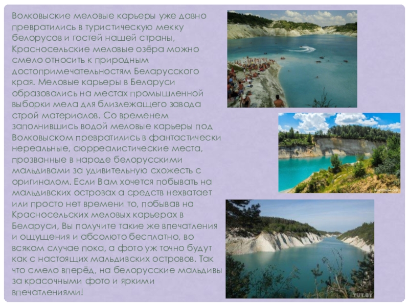 Слайд 4Волковыские меловые карьеры уже давно превратились в туристическую мекку белорусов и