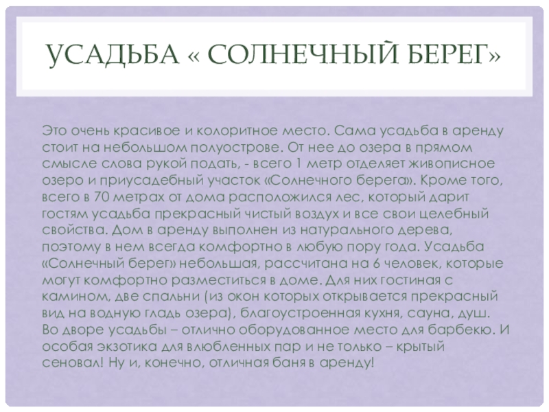в аренду стоит на небольшом полуострове. От нее до озера в прямом смысле слова рукой подать, - всего 1 метр отделяет живописное озеро и приусадебный участок «Солнечного берега». Кроме того, всего в 70 метрах от дома расположился лес, который дарит гостям усадьба прекрасный чистый воздух и все свои целебный свойства. Дом в аренду выполнен из натурального дерева, поэтому в нем всегда комфортно в любую пору года. Усадьба «Солнечный берег» небольшая, рассчитана на 6 человек, которые могут комфортно разместиться в доме. Для них гостиная с камином, две спальни (из окон которых открывается прекрасный вид на водную гладь озера), благоустроенная кухня, сауна, душ. Во дворе усадьбы – отлично оборудованное место для барбекю. И особая экзотика для влюбленных пар и не только – крытый сеновал! Ну и, конечно, отличная баня в аренду!