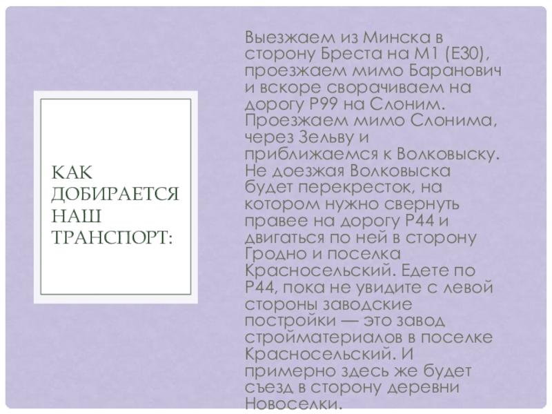 Слайд 5Выезжаем из Минска в сторону Бреста на М1 (Е30), проезжаем мимо
