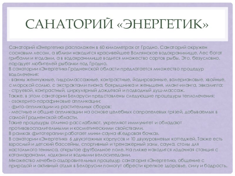 Санаторий «Энергетик» расположен в 60 километрах от Гродно. Санаторий окружен