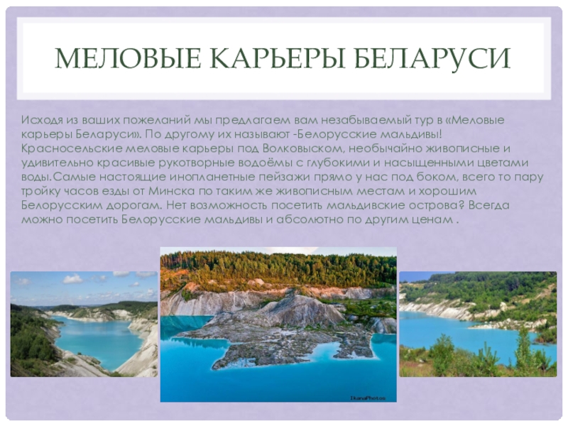 карьеры Беларуси». По другому их называют -Белорусские мальдивы! Красносельские меловые карьеры под Волковыском, необычайно живописные и удивительно красивые рукотворные водоёмы с глубокими и насыщенными цветами воды.Самые настоящие инопланетные пейзажи прямо у нас под боком, всего то пару тройку часов езды от Минска по таким же живописным местам и хорошим Белорусским дорогам. Нет возможность посетить мальдивские острова? Всегда можно посетить Белорусские мальдивы и абсолютно по другим ценам .