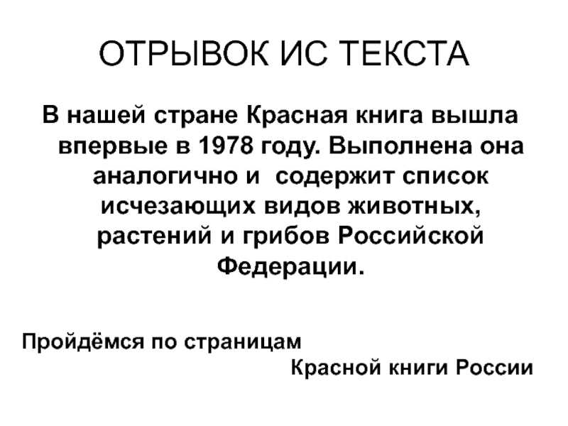 ОТРЫВОК ИС ТЕКСТАВ нашей стране Красная книга вышла впервые в 1978 году. Выполнена она аналогично и содержит