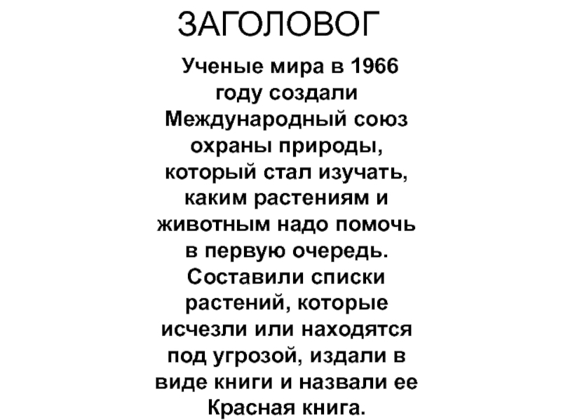 ЗАГОЛОВОГ Ученые мира в 1966 году создали Международный союз охраны природы, который стал изучать, каким растениям и животным надо помочь в первую очередь. Составили списки растений, которые исчезли или находятся под угрозой, издали в виде книги и