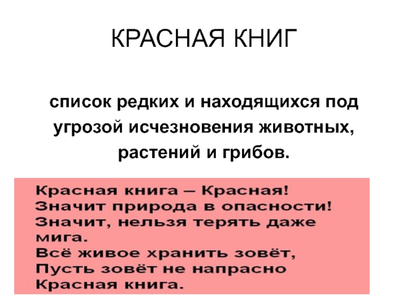 КРАСНАЯ КНИГсписок редких и находящихся подугрозой исчезновения животных,растений и грибов.