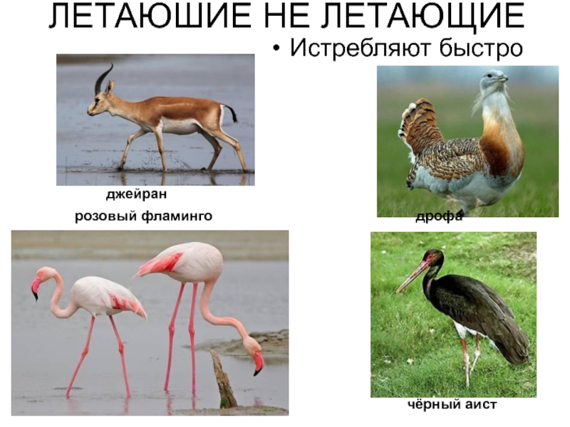 ЛЕТАЮШИЕ НЕ ЛЕТАЮЩИЕИстребляют быстродрофарозовый фламингоджейранчёрный аист
