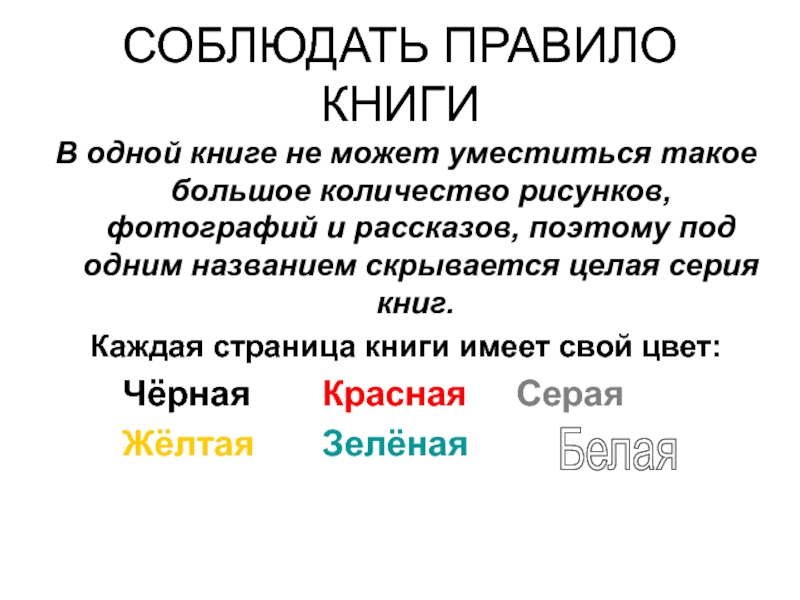 СОБЛЮДАТЬ ПРАВИЛО КНИГИВ одной книге не может уместиться такое большое количество рисунков, фотографий и рассказов, поэтому под