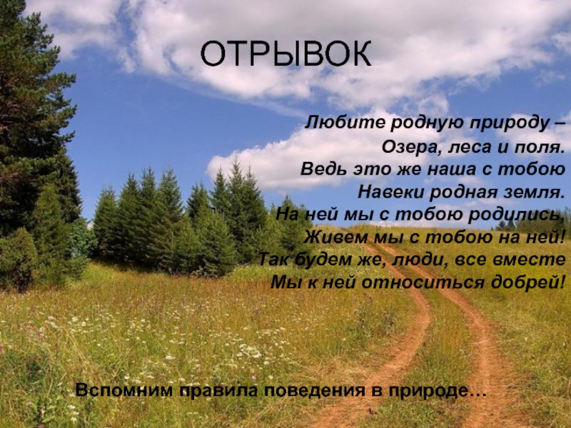 ОТРЫВОК	Любите родную природу – Озера, леса и поля. Ведь это же наша с тобою  Навеки родная
