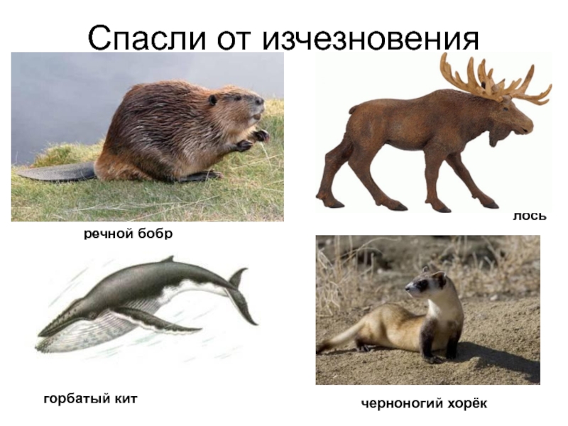 речной бобрлосьчерноногий хорёкгорбатый китСпасли от изчезновения