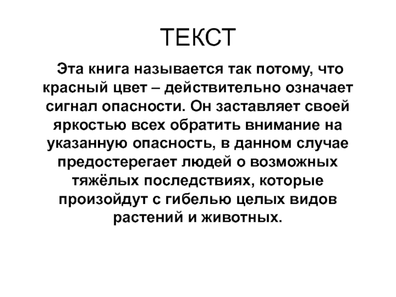 ТЕКСТ	Эта книга называется так потому, что красный цвет – действительно означает сигнал опасности. Он заставляет своей яркостью