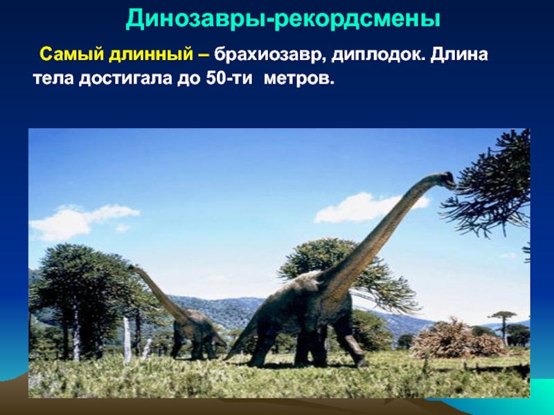 Самый длинный – брахиозавр, диплодок. Длина тела достигала до