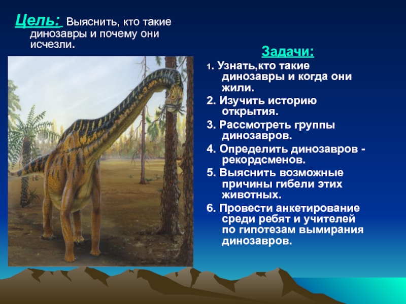 Слайд 3Цель: Выяснить, кто такие динозавры и почему они исчезли.